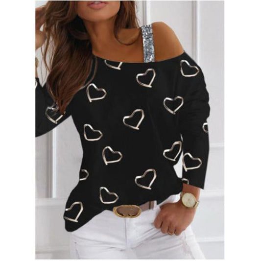 Women Shoulder Long Sleeve T-shirt Heart-shaped