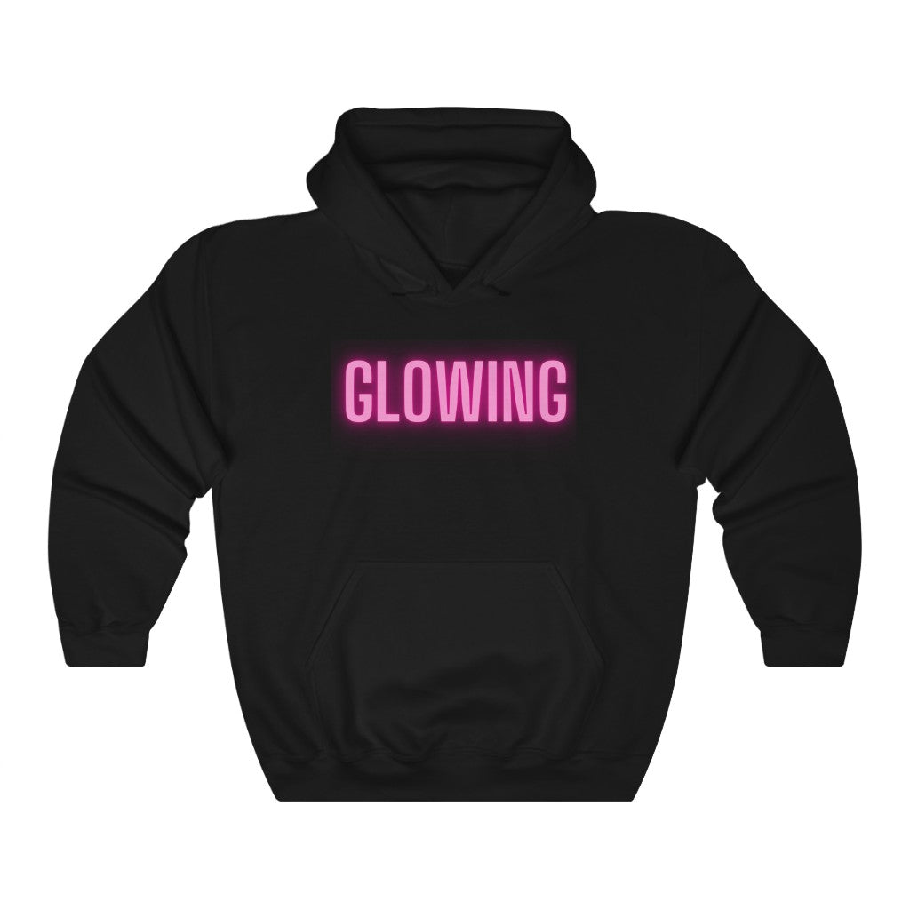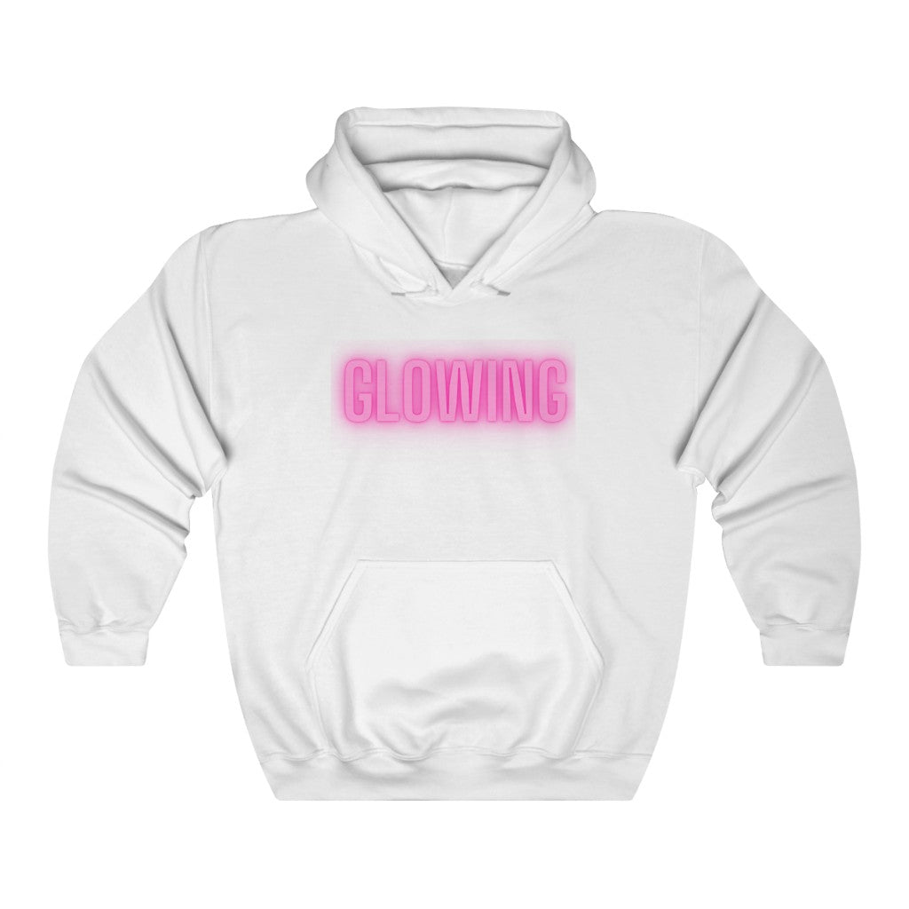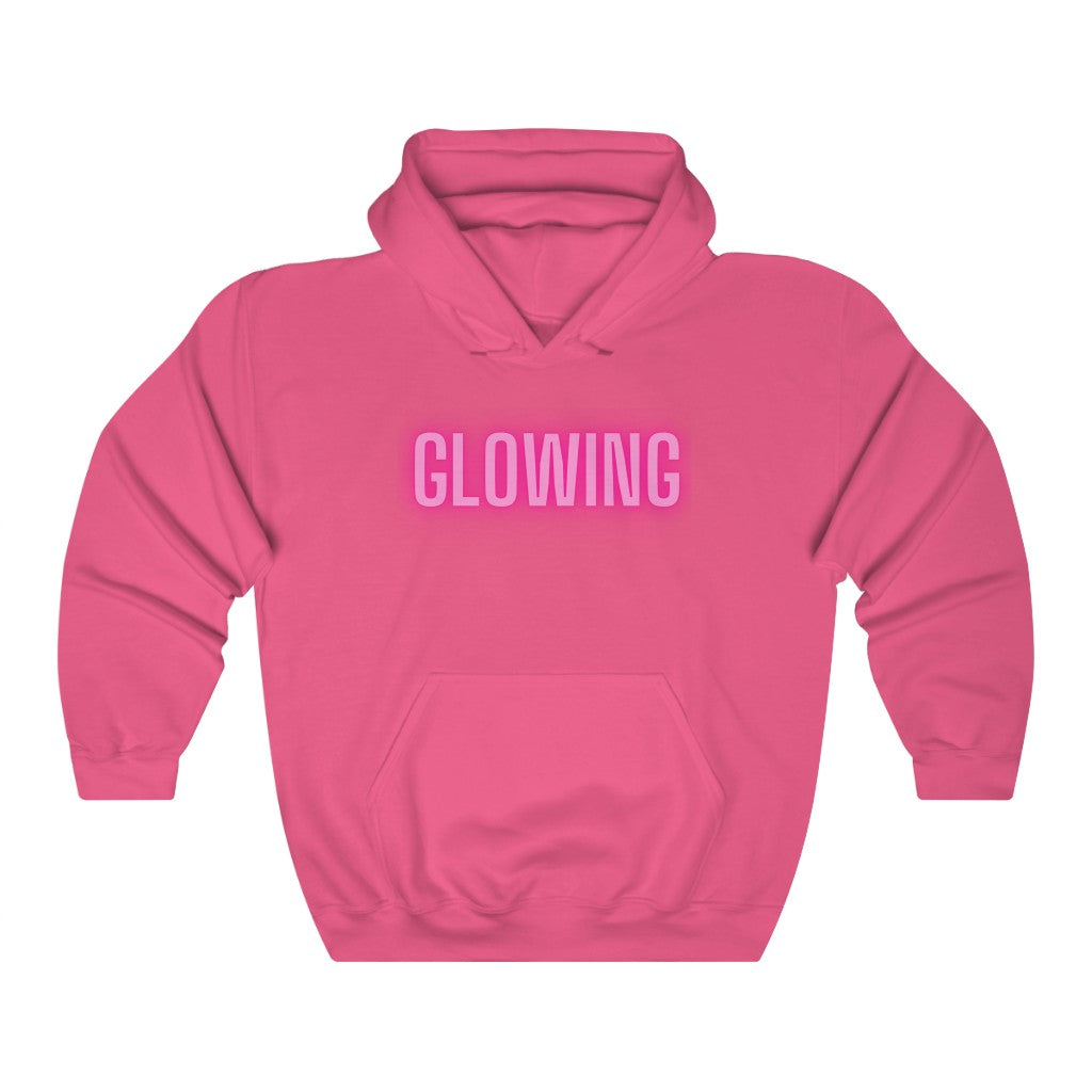 This GLOWING unisex heavy blend hooded sweatshirt is relaxation itself. The material is a thick blend of cotton and polyester. This makes for a plush, soft feel alongside warmth. There are no side seams. A spacious kangaroo pocket hangs in front. The hood's drawstring is the same color as the base sweater. What a great way to show off just how happy and GLOWING you are.