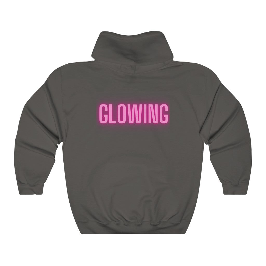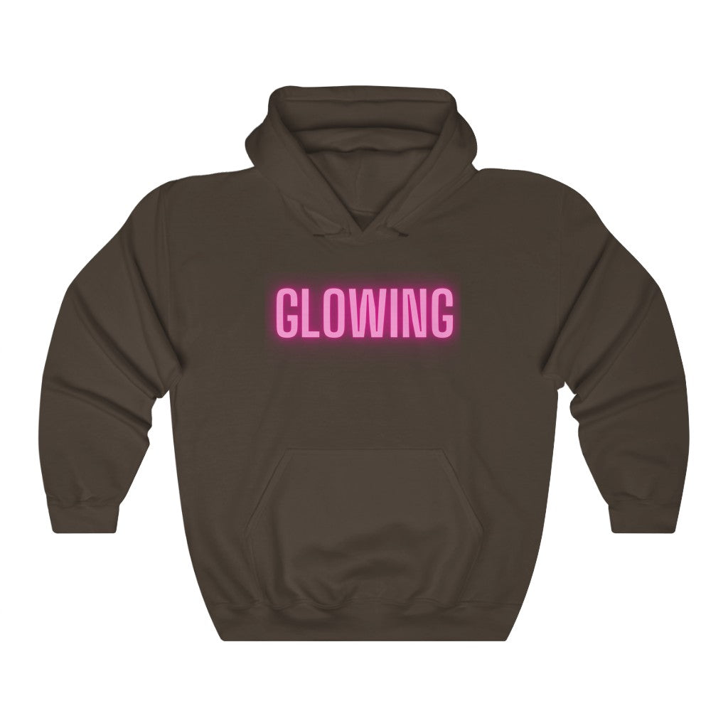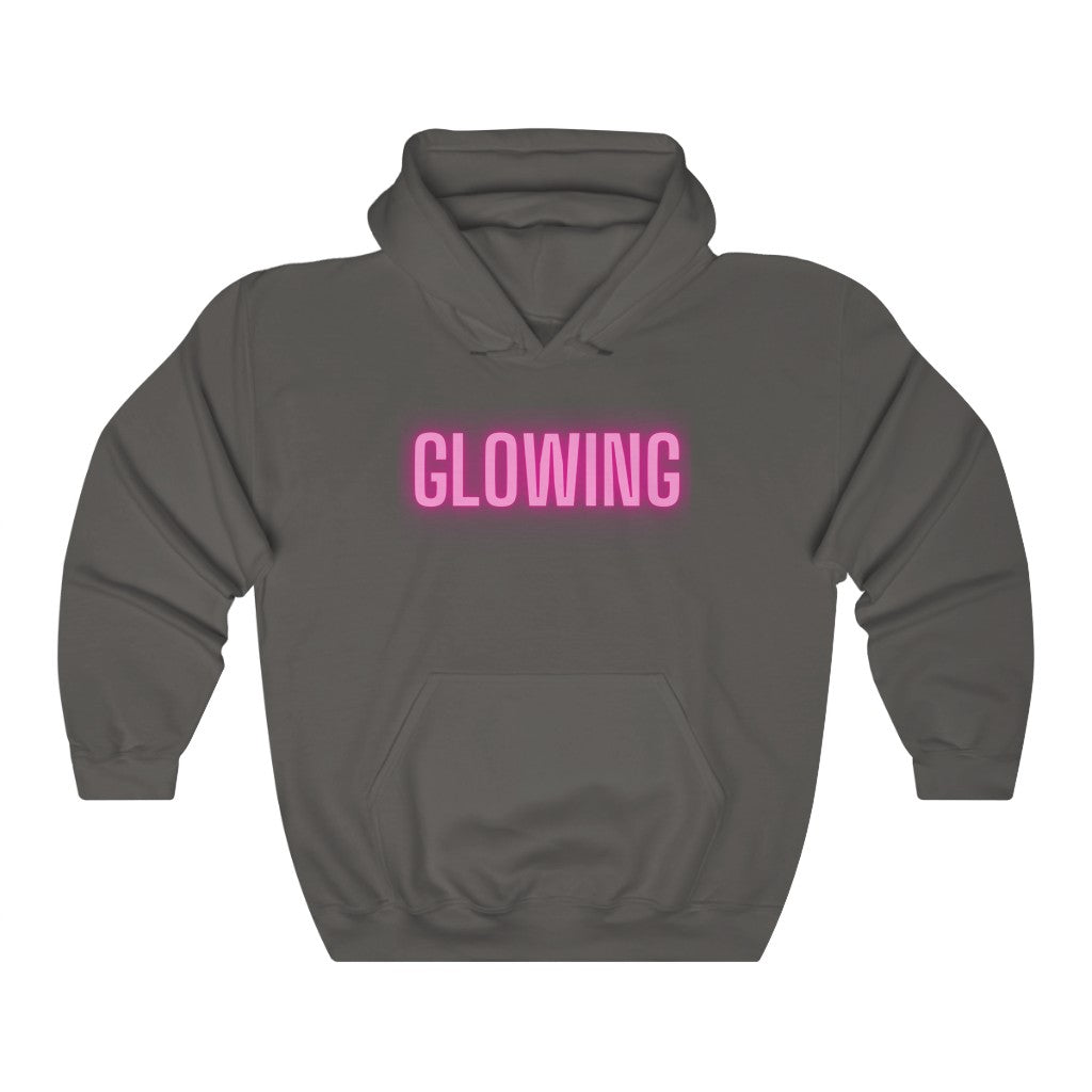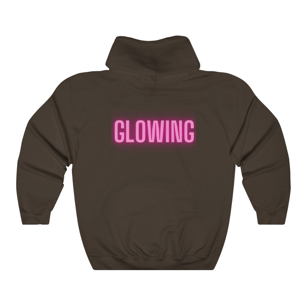 This GLOWING unisex heavy blend hooded sweatshirt is relaxation itself. The material is a thick blend of cotton and polyester. This makes for a plush, soft feel alongside warmth. There are no side seams. A spacious kangaroo pocket hangs in front. The hood's drawstring is the same color as the base sweater. What a great way to show off just how happy and GLOWING you are.